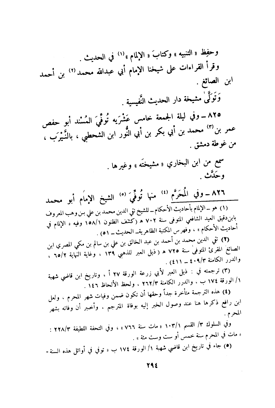 825 - وَفِي لَيْلَة الْجُمُعَة خَامِس عشريه توفّي الْمسند ابو حَفْص عمر بن مُحَمَّد بن أبي بكر بن أبي النُّور ابْن الشحطبي بالنيرب من غوطة دمشق