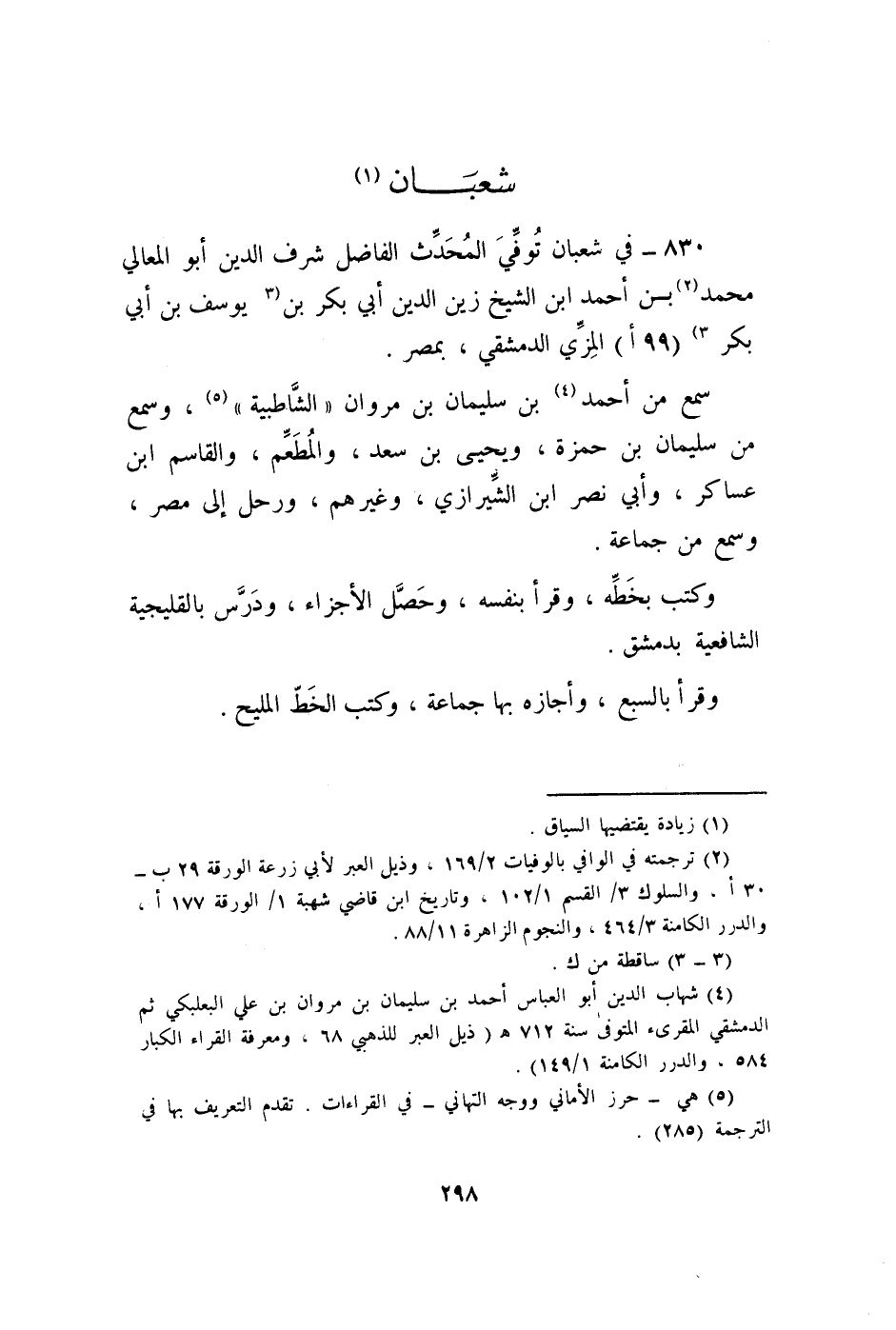 830 - فِي شعْبَان توفّي الْمُحدث الْفَاضِل شرف الدّين أَبُو الْمَعَالِي مُحَمَّد بن أَحْمد ابْن الشَّيْخ زين الدّين أبي بكر بن يُوسُف بن أبي بكر (99 أ) الْمزي الدِّمَشْقِي بِمصْر