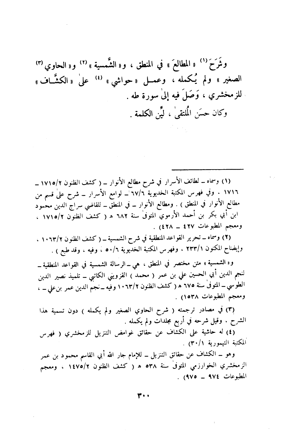 وَشرح الْمطَالع فِي الْمنطق والشمسية وَالْحَاوِي الصَّغِير وَلم يكمله وَعمل حَوَاشِي على الْكَشَّاف للزمخشري وصل فِيهِ إِلَى سُورَة طه