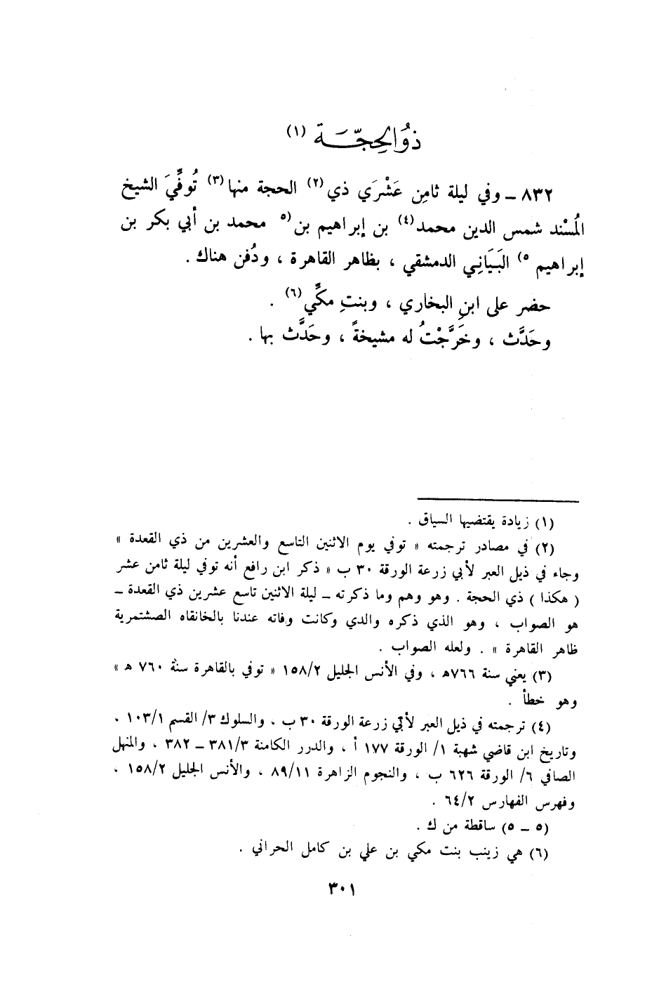 832 - وَفِي لَيْلَة ثامن عشري ذِي الْحجَّة مِنْهَا توفّي الشَّيْخ الْمسند شمس الدّين مُحَمَّد بن إِبْرَاهِيم بن مُحَمَّد بن أبي بكر بن إِبْرَاهِيم الْبَيَانِي الدِّمَشْقِي بِظَاهِر الْقَاهِرَة وَدفن هُنَاكَ