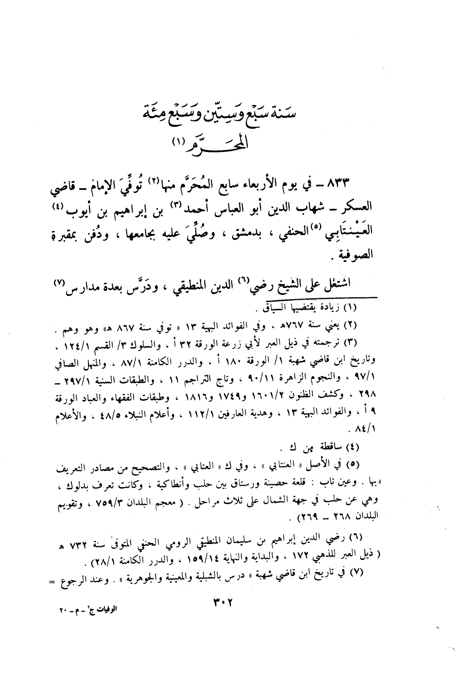 833 - فِي يَوْم الْأَرْبَعَاء سَابِع الْمحرم مِنْهَا توفّي الْأَمَام قَاضِي الْعَسْكَر شهَاب الدّين أَبُو الْعَبَّاس أَحْمد بن إِبْرَاهِيم بن أَيُّوب العينتابي الْحَنَفِيّ بِدِمَشْق وَصلي عَلَيْهِ بجامعها وَدفن بمقبرة الصُّوفِيَّة
