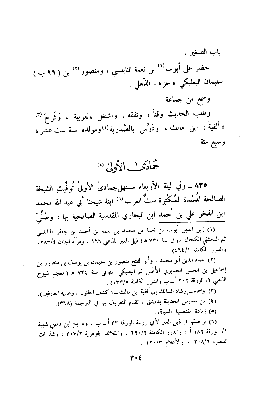 835 - وَفِي لَيْلَة الْأَرْبَعَاء مستهل جُمَادَى الأولى توفيت الشيخة الصَّالِحَة المسندة المكثرة سِتّ الْعَرَب ابْنة شَيخنَا أبي عبد الله مُحَمَّد ابْن الْفَخر عَليّ بن أَحْمد ابْن البُخَارِيّ المقدسية الصالحية بهَا وَصلي