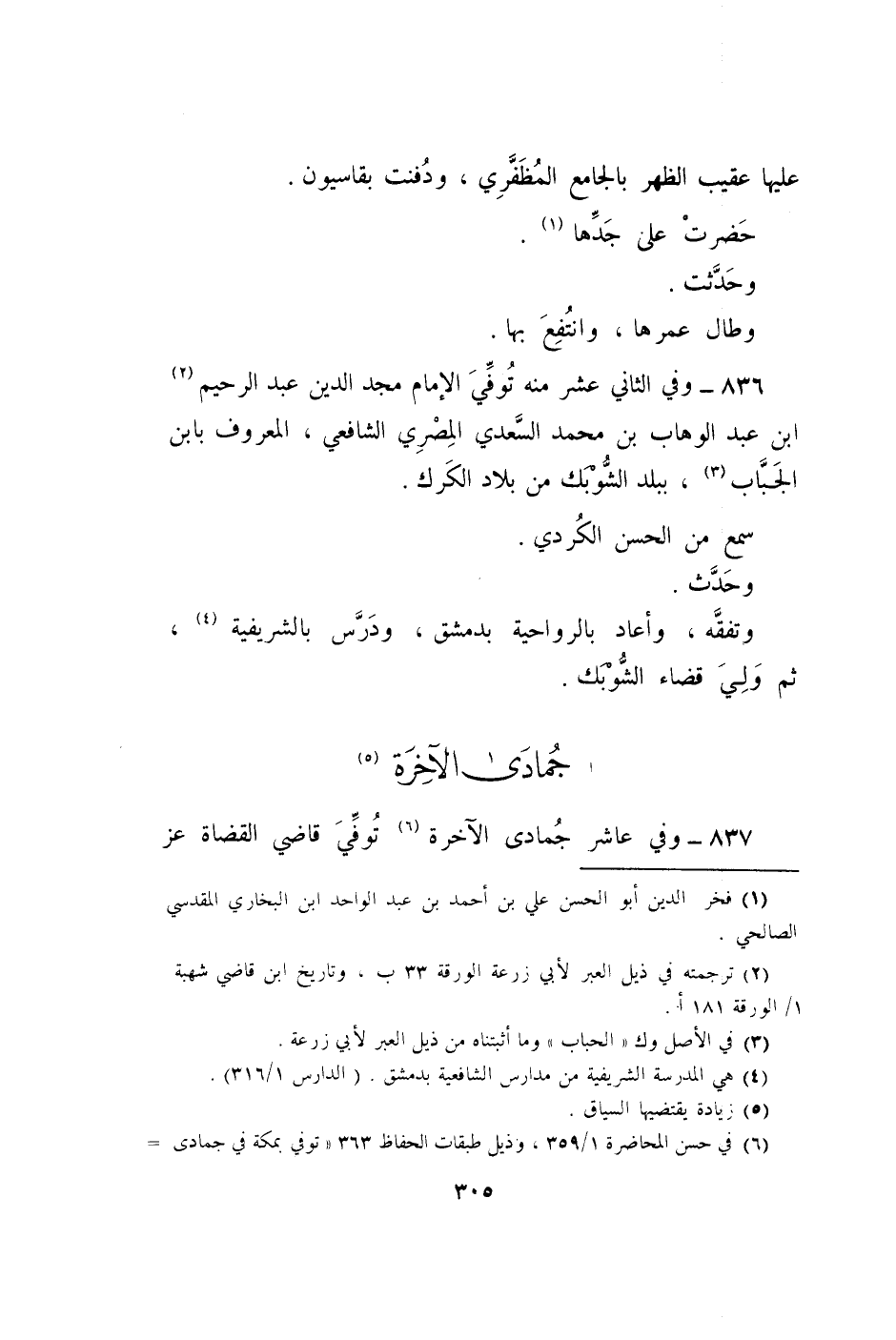 836 - وَفِي الثَّانِي عشر مِنْهُ توفّي الإِمَام مجد الدّين عبد الرَّحِيم بن عبد الْوَهَّاب بن مُحَمَّد السَّعْدِيّ الْمصْرِيّ الشَّافِعِي الْمَعْرُوف بِابْن الْجبَاب بِبَلَد الشوبك من بِلَاد الكرك