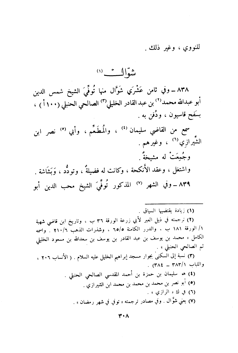 838 - وَفِي ثامن عشري شَوَّال مِنْهَا توفّي الشَّيْخ شمس الدّين أَبُو عبد الله مُحَمَّد بن عبد الْقَادِر الخليلي الصَّالِحِي الْحَنْبَلِيّ (100 أ) بسفح قاسيون وَدفن بِهِ