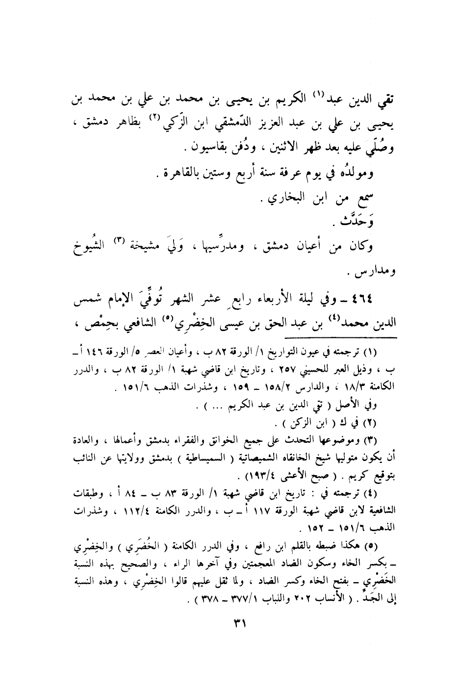 464 - وَفِي لَيْلَة الْأَرْبَعَاء رَابِع عشر الشَّهْر توفّي الإِمَام شمس الدّين مُحَمَّد بن عبد الْحق بن عِيسَى الخضري الشَّافِعِي بحمص