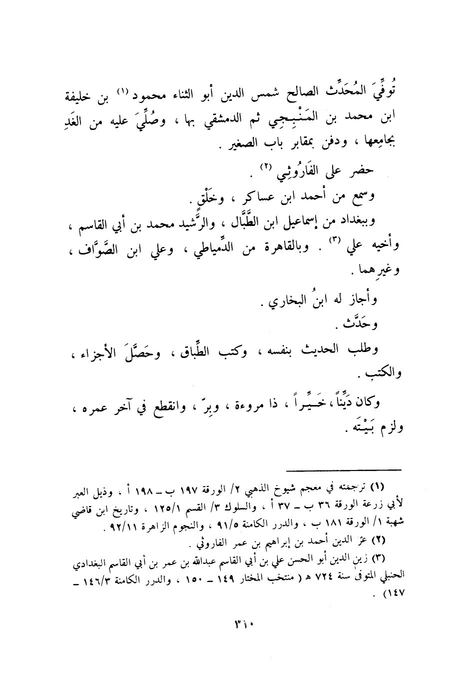 توفّي الْمُحدث الصَّالح شمس الدّين أَبُو الثَّنَاء مَحْمُود بن خَليفَة بن مُحَمَّد بن المنبجي ثمَّ الدِّمَشْقِي بهَا وَصلي عَلَيْهِ من الْغَد بجامعها وَدفن بمقابر بَاب الصَّغِير