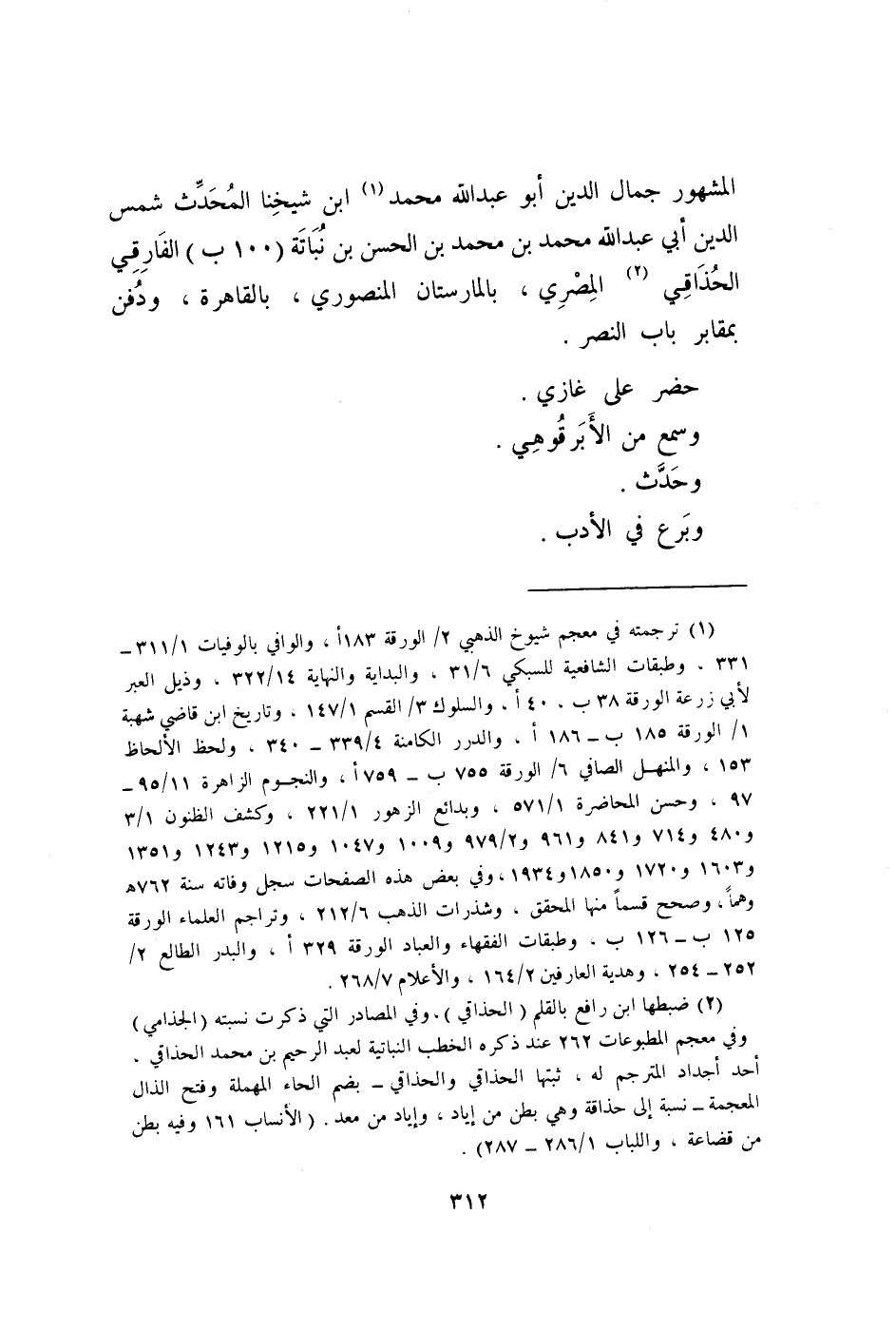 الْمَشْهُور جمال الدّين أَبُو عبد الله مُحَمَّد ابْن شَيخنَا الْمُحدث شمس الدّين أبي عبد الله مُحَمَّد بن مُحَمَّد بن الْحسن بن نباتة (100 ب) الفارقي الحذاقي الْمصْرِيّ بالمارستان المنصوري بِالْقَاهِرَةِ وَدفن بمقابر بَاب النَّصْر