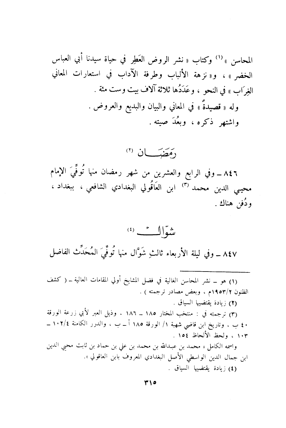 847 - وَفِي لَيْلَة الْأَرْبَعَاء ثَالِث شَوَّال مِنْهَا توفّي الْمُحدث الْفَاضِل
