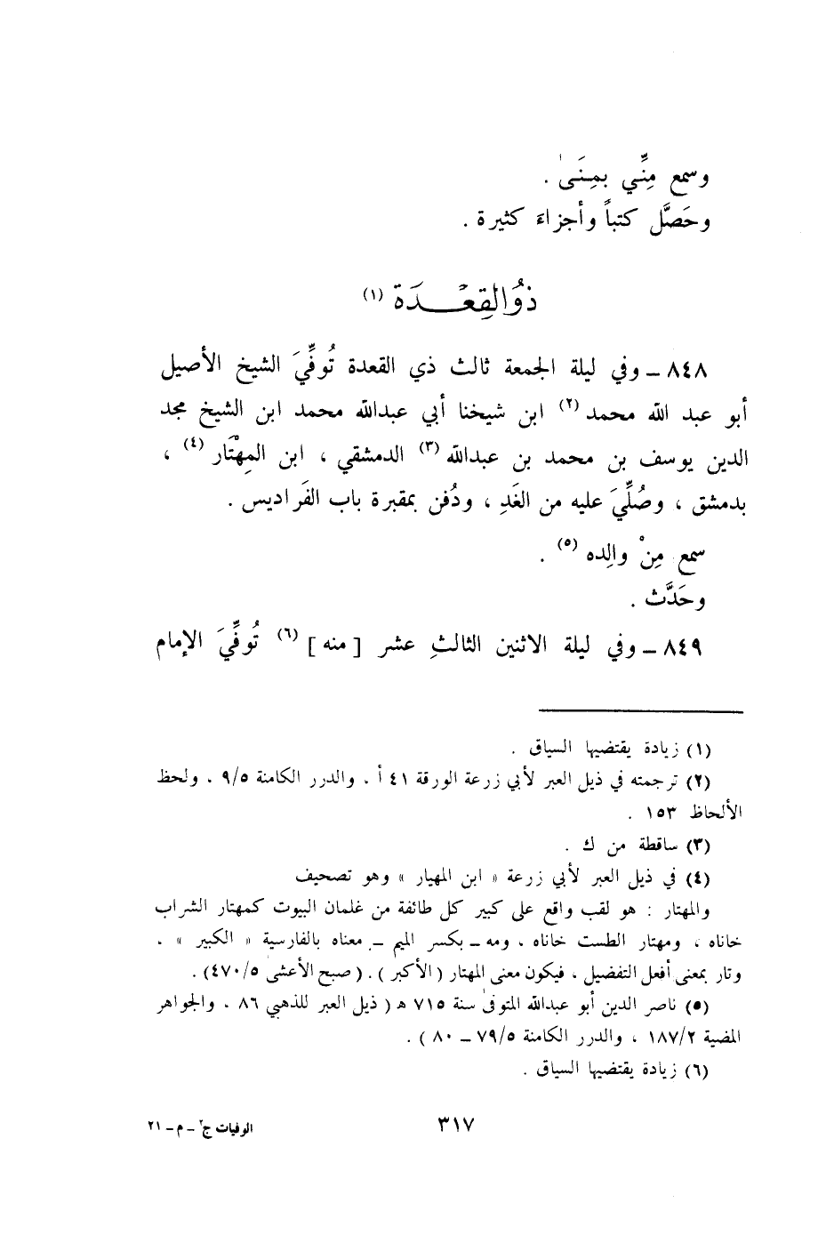 848 - وَفِي لَيْلَة الْجُمُعَة ثَالِث ذِي الْقعدَة توفّي الشَّيْخ الْأَصِيل أَبُو عبد الله مُحَمَّد ابْن شَيخنَا أبي عبد الله مُحَمَّد ابْن الشَّيْخ مجد الدّين يُوسُف بن مُحَمَّد بن عبد الله الدِّمَشْقِي ابْن المهتار بِدِمَشْق وَصلي عَلَيْهِ من الْغَد وَدفن بمقبرة بَاب الفراديس