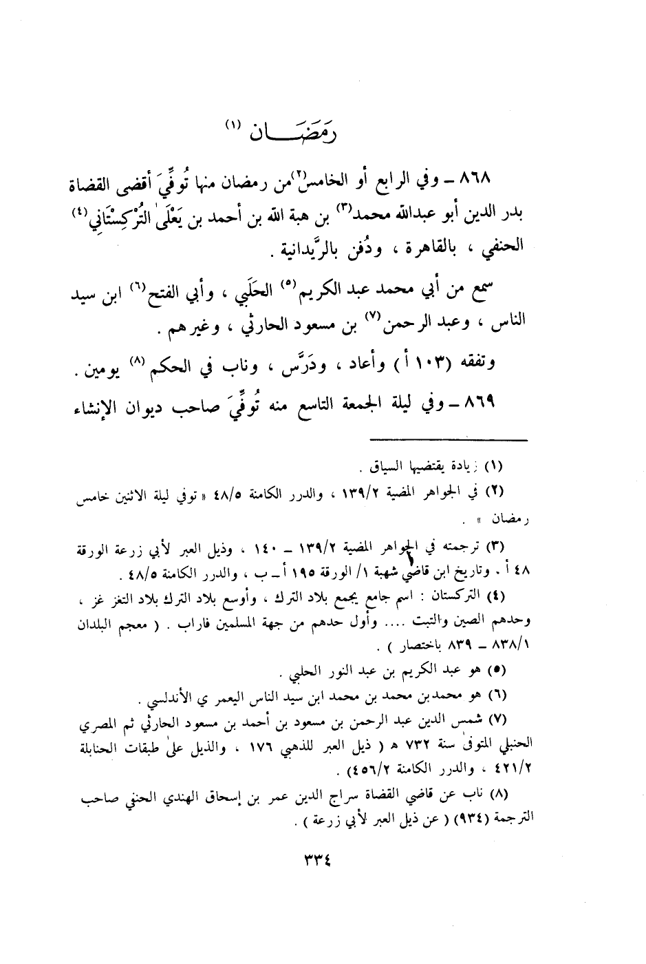 868 - وَفِي الرَّابِع أَو الْخَامِس من رَمَضَان مِنْهَا توفّي أقضى الْقُضَاة بدر الدّين أَبُو عبد الله مُحَمَّد بن هبة الله بن أَحْمد بن يعلى التركستاني الْحَنَفِيّ بِالْقَاهِرَةِ وَدفن بالريدانية