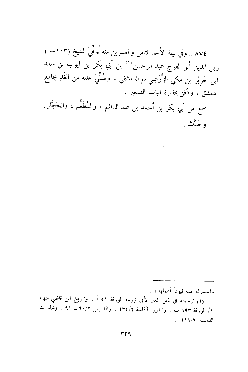 874 - وَفِي لَيْلَة الْأَحَد الثَّامِن وَالْعِشْرين مِنْهُ توفّي الشَّيْخ (103 ب) زين الدّين أَبُو الْفرج عبد الرَّحْمَن بن أبي بكر بن أَيُّوب بن سعد ابْن حريز بن مكي الزرعي ثمَّ الدِّمَشْقِي وَصلي عَلَيْهِ من الْغَد بِجَامِع دمشق وَدفن بمقبرة الْبَاب الصَّغِير