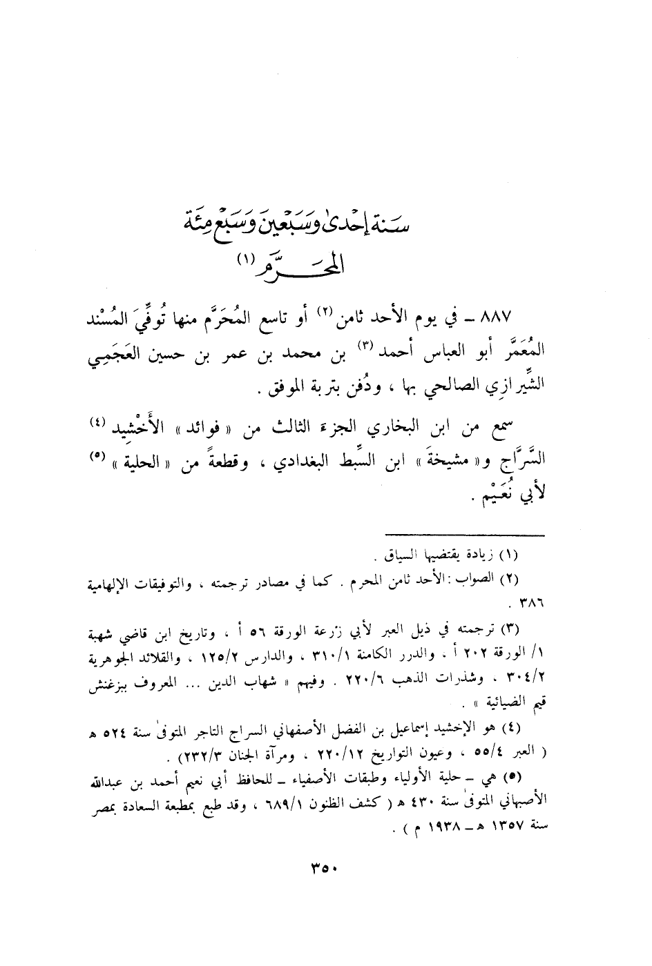 887 - فِي يَوْم الْأَحَد ثامن أَو تَاسِع الْمحرم مِنْهَا توفّي الْمسند المعمر أَبُو الْعَبَّاس أَحْمد بن مُحَمَّد بن عمر بن حُسَيْن العجمي الشِّيرَازِيّ الصَّالِحِي بهَا وَدفن بتربة الْمُوفق