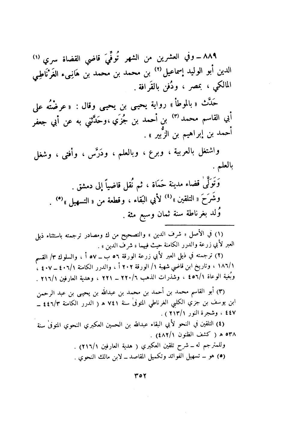 889 - وَفِي الْعشْرين من الشَّهْر توفّي قَاضِي الْقُضَاة سري الدّين أَبُو الْوَلِيد إِسْمَاعِيل بن مُحَمَّد بن مُحَمَّد بن هانىء الغرناطي الْمَالِكِي بِمصْر وَدفن بالقرافة