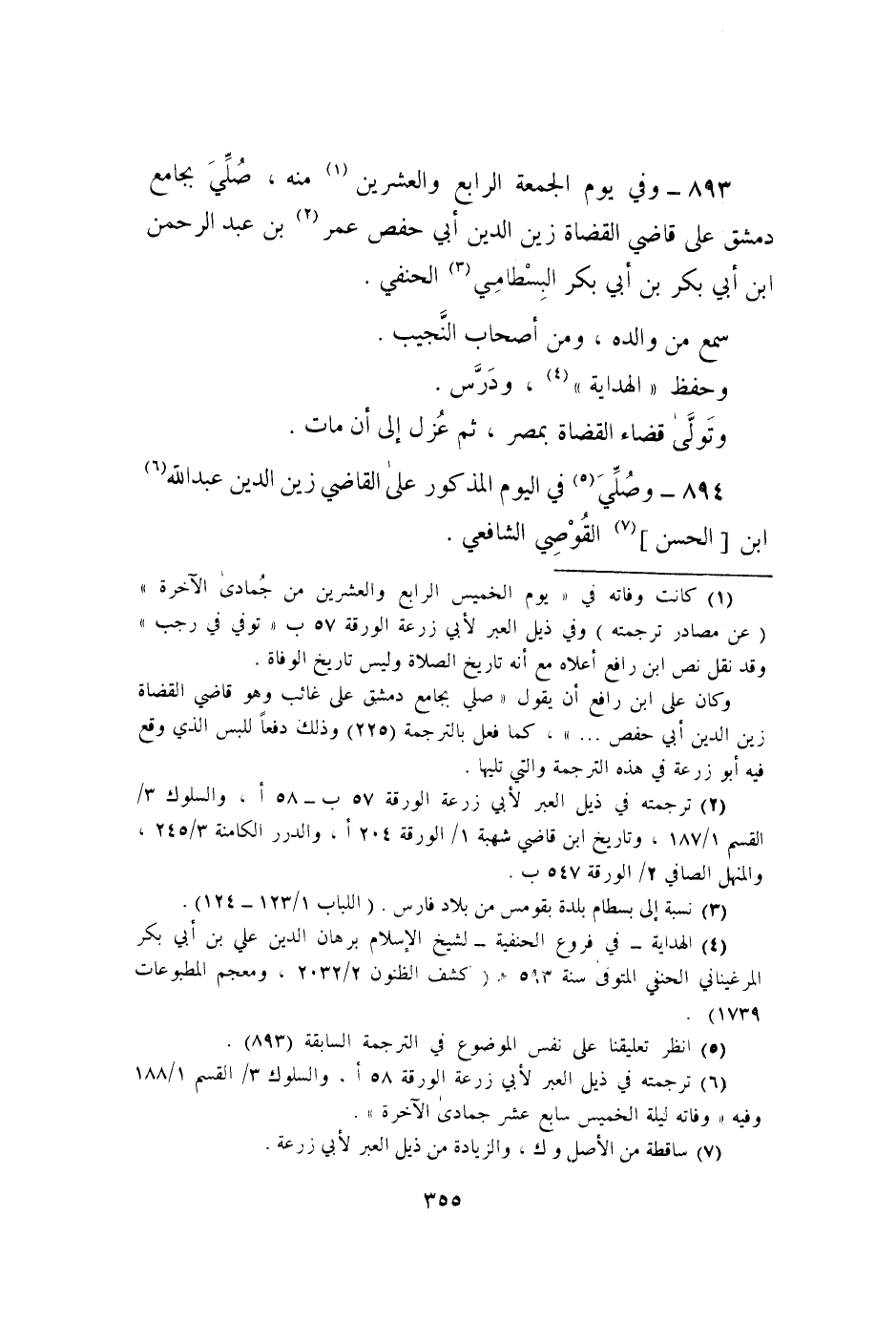893 - وَفِي يَوْم الْجُمُعَة الرَّابِع وَالْعِشْرين مِنْهُ صلي بِجَامِع دمشق على قَاضِي الْقُضَاة زين الدّين أبي حَفْص عمر بن عبد الرَّحْمَن بن أبي بكر بن أبي بكر البسطامي الْحَنَفِيّ