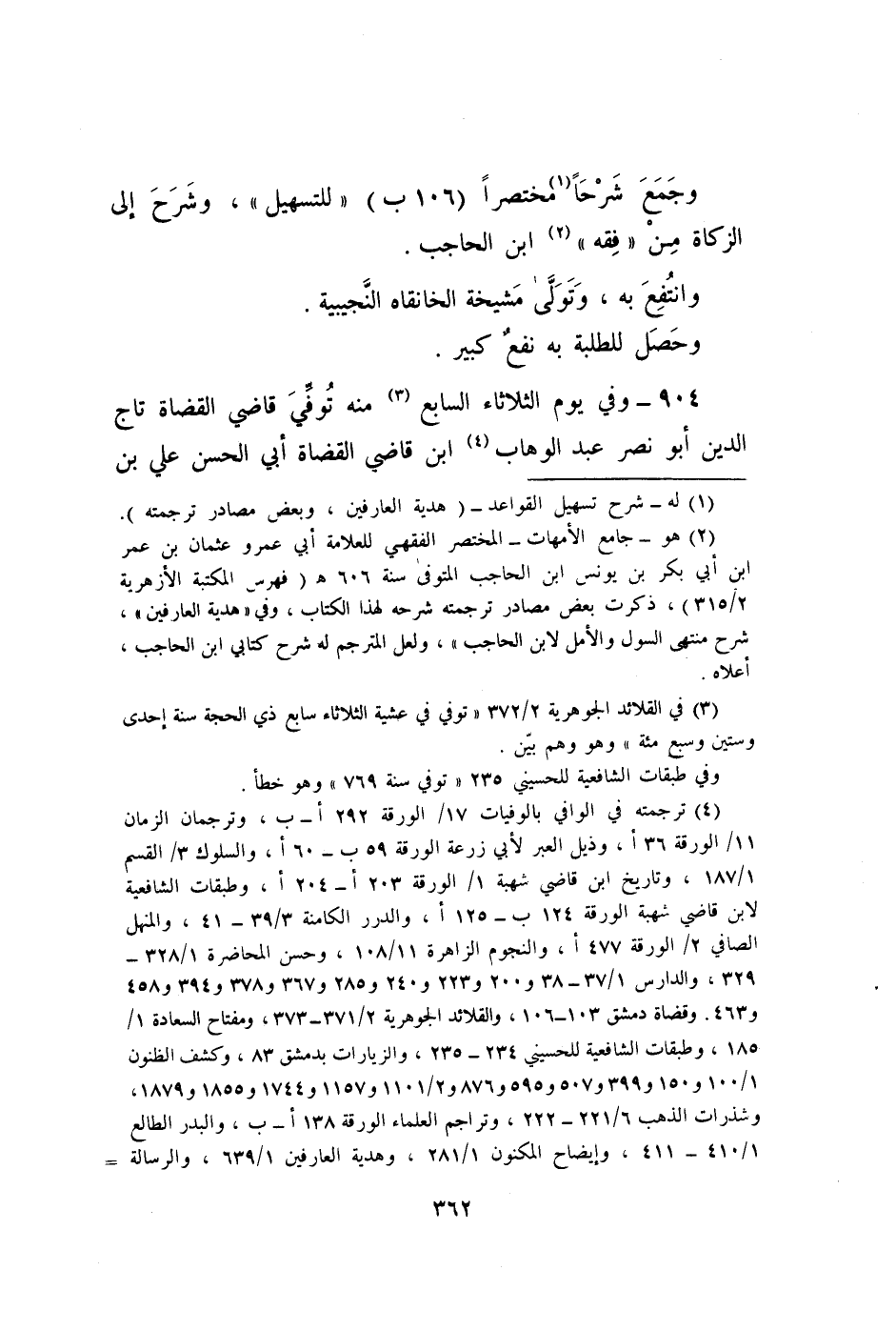 904 - وَفِي يَوْم الثُّلَاثَاء السَّابِع مِنْهُ توفّي قَاضِي الْقُضَاة تَاج الدّين أَبُو نصر عبد الْوَهَّاب ابْن قَاضِي الْقُضَاة أبي الْحسن عَليّ بن