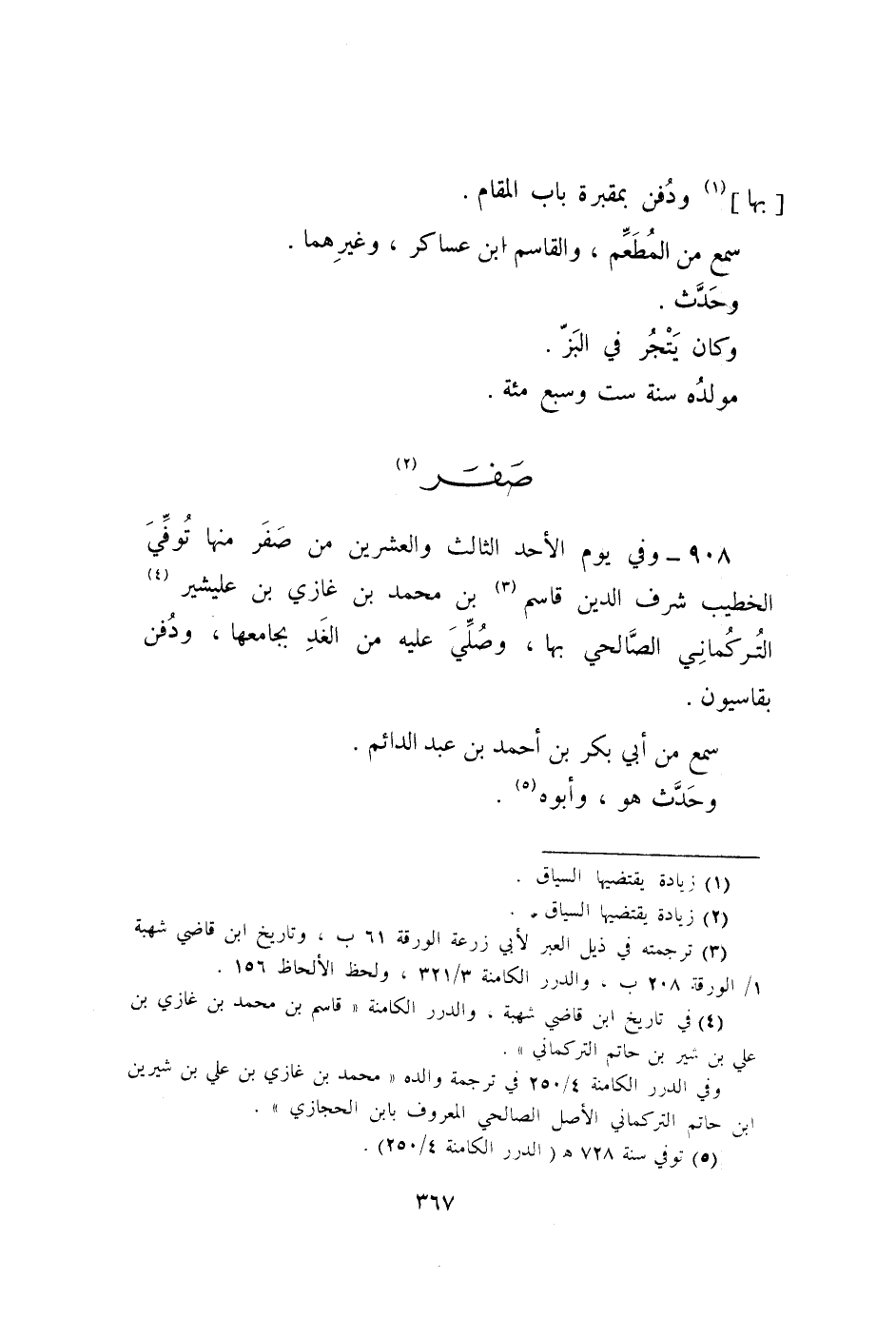 908 - وَفِي يَوْم الْأَحَد الثَّالِث وَالْعِشْرين من صفر مِنْهَا توفّي الْخَطِيب شرف الدّين قَاسم بن مُحَمَّد بن غَازِي بن عليشير التركماني الصَّالِحِي بهَا وَصلي عَلَيْهِ من الْغَد بجامعها وَدفن بقاسيون