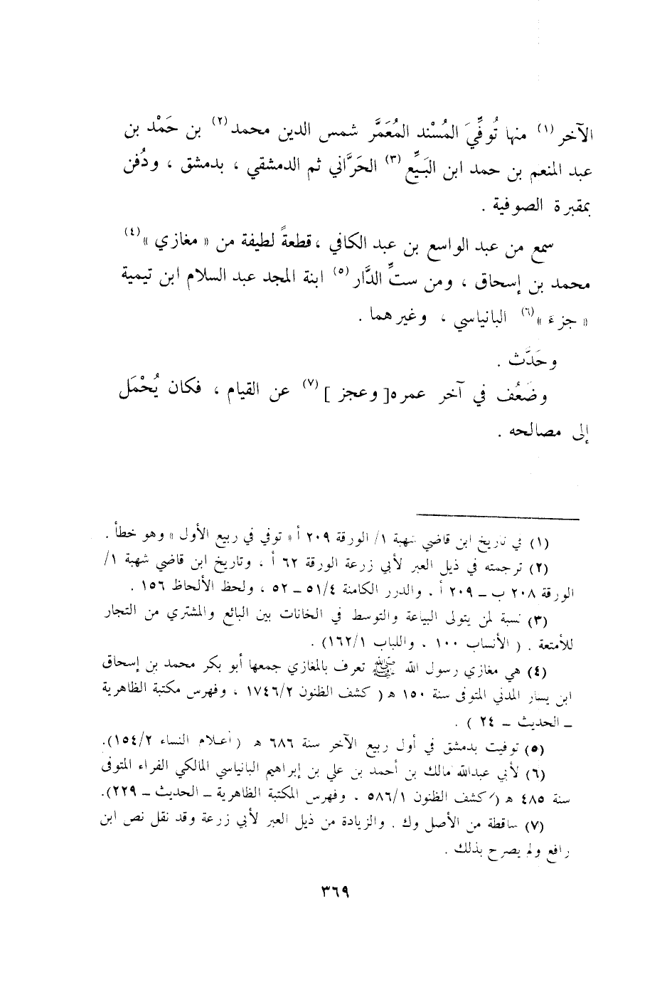 الآخر مِنْهَا توفّي الْمسند المعمر شمس الدّين مُحَمَّد بن حمد بن عبد الْمُنعم بن حمد ابْن البيع الْحَرَّانِي ثمَّ الدِّمَشْقِي بِدِمَشْق وَدفن بمقبرة الصُّوفِيَّة