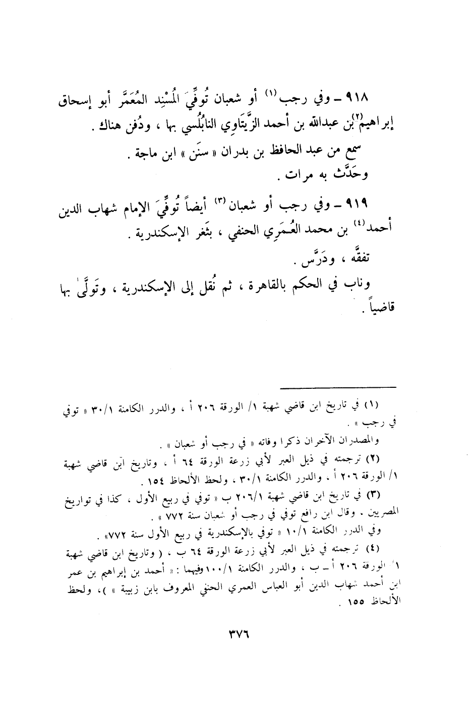 918 - وَفِي رَجَب أَو شعْبَان توفّي الْمسند المعمر أَبُو إِسْحَاق إِبْرَاهِيم بن عبد الله بن أَحْمد الزيتاوي النابلسي بهَا وَدفن هُنَاكَ
