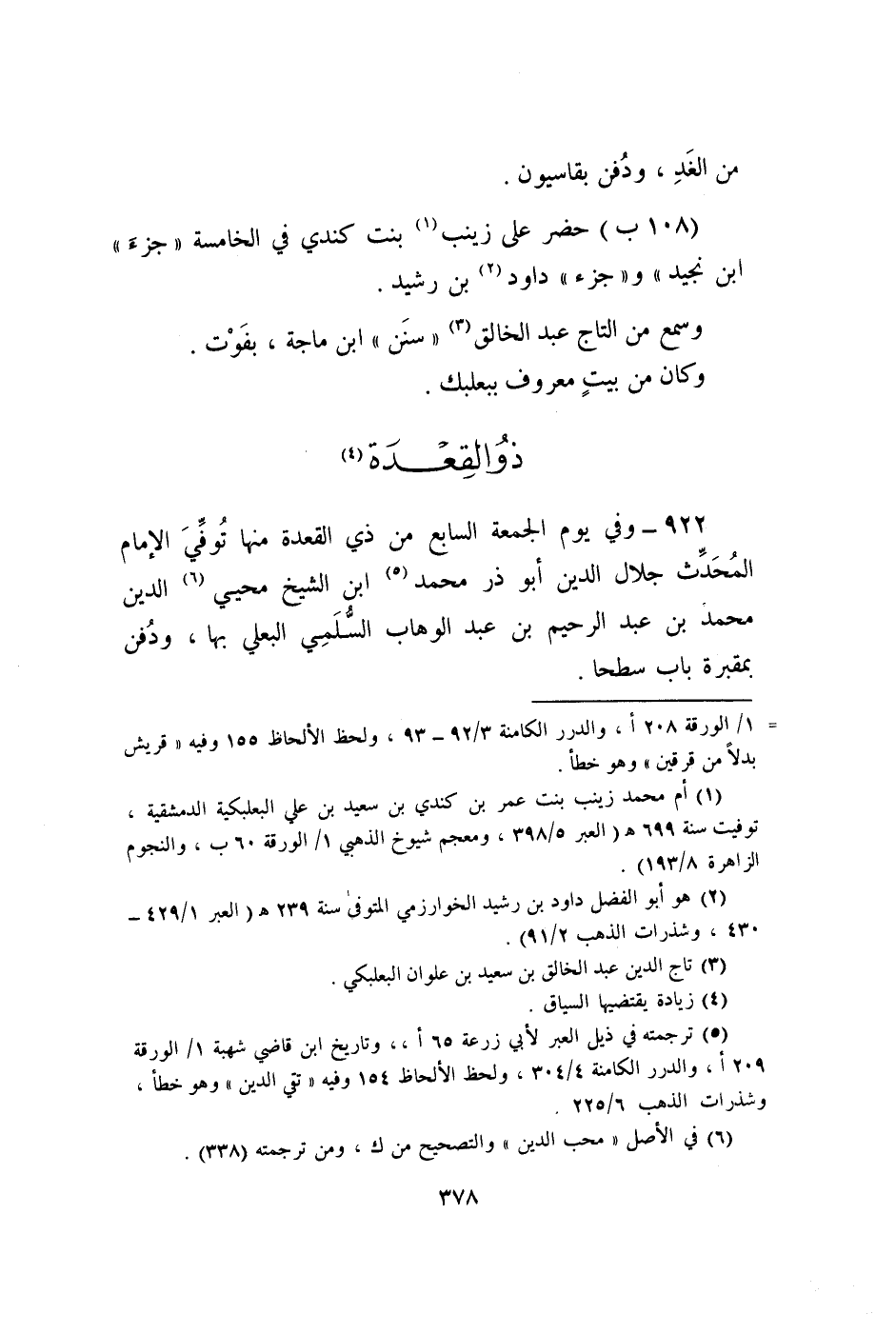 922 - وَفِي يَوْم الْجُمُعَة السَّابِع من ذِي الْقعدَة مِنْهَا توفّي الإِمَام الْمُحدث جلال الدّين أَبُو ذَر مُحَمَّد ابْن الشَّيْخ محيي الدّين مُحَمَّد بن عبد الرَّحِيم بن عبد الْوَهَّاب السّلمِيّ البعلي بهَا وَدفن بمقبرة بَاب سطحا