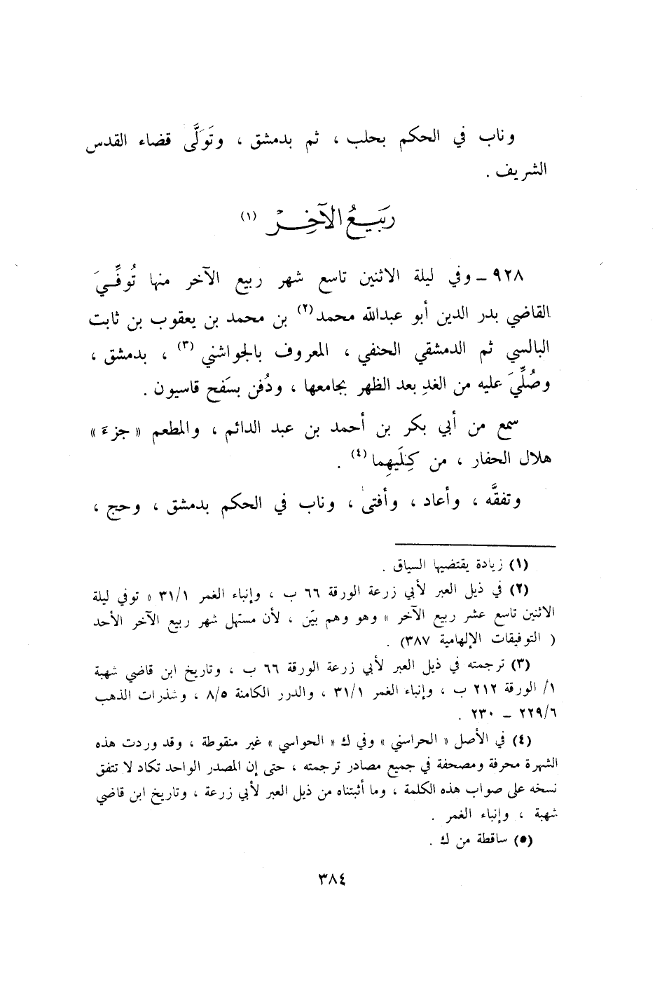 928 - وَفِي لَيْلَة الِاثْنَيْنِ تَاسِع شهر ربيع الآخر مِنْهَا توفّي القَاضِي بدر الدّين أَبُو عبد الله مُحَمَّد بن مُحَمَّد بن يَعْقُوب بن ثَابت البالسي ثمَّ الدِّمَشْقِي الْحَنَفِيّ الْمَعْرُوف بالجواشني بِدِمَشْق وَصلي عَلَيْهِ من الْغَد بعد الظّهْر بجامعها وَدفن بسفح قاسيون