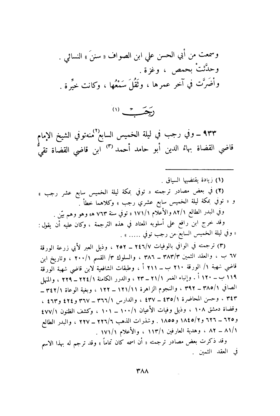 933 - وَفِي رَجَب فِي لَيْلَة الْخَمِيس السَّابِع مِنْهُ توفّي الشَّيْخ الإِمَام قَاضِي الْقُضَاة بهاء الدّين أَبُو حَامِد أَحْمد ابْن قَاضِي الْقُضَاة تَقِيّ