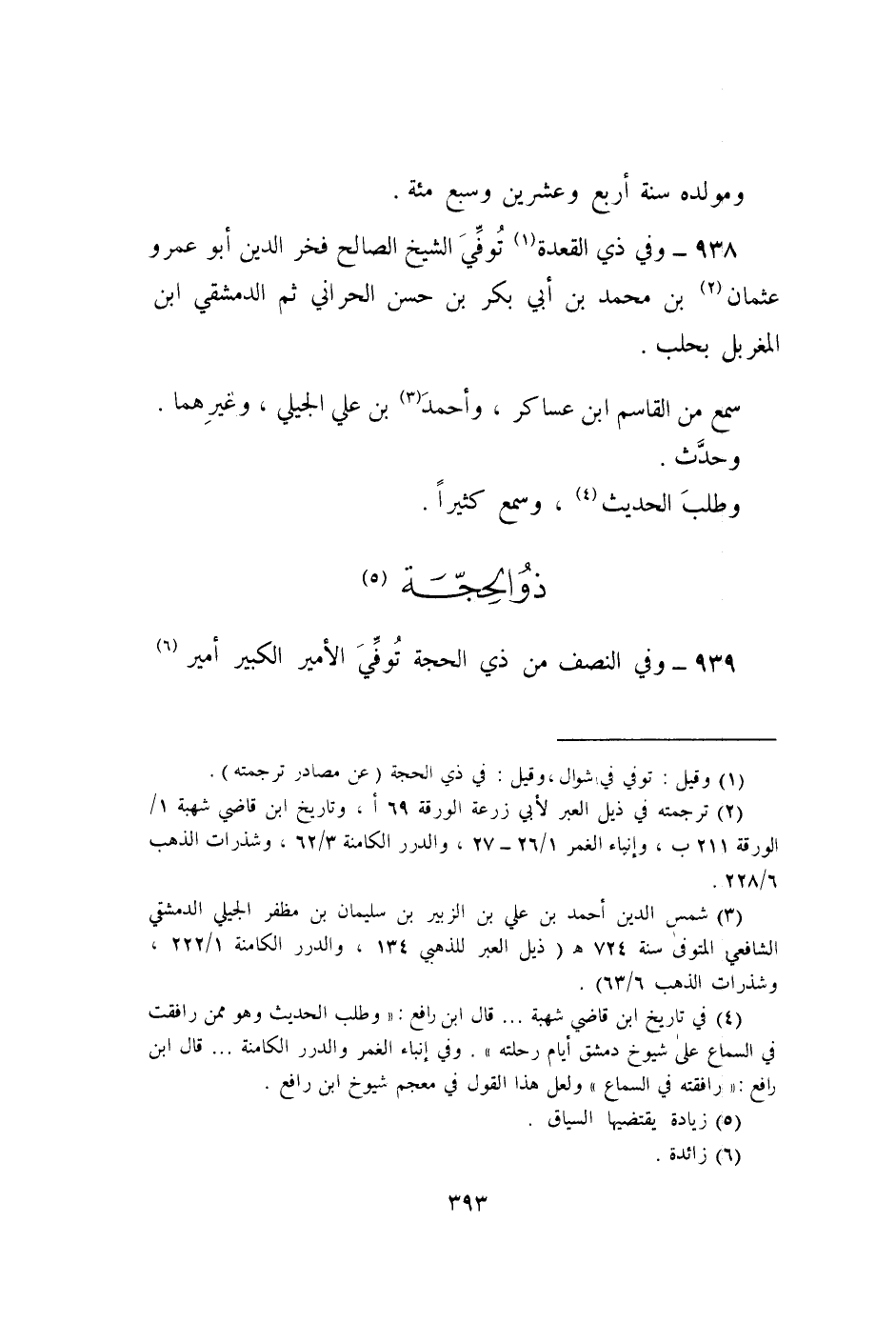 938 - وَفِي ذِي الْقعدَة توفّي الشَّيْخ الصَّالح فَخر الدّين أَبُو عَمْرو عُثْمَان بن مُحَمَّد بن أبي بكر بن حسن الْحَرَّانِي ثمَّ الدِّمَشْقِي ابْن المغربل بحلب