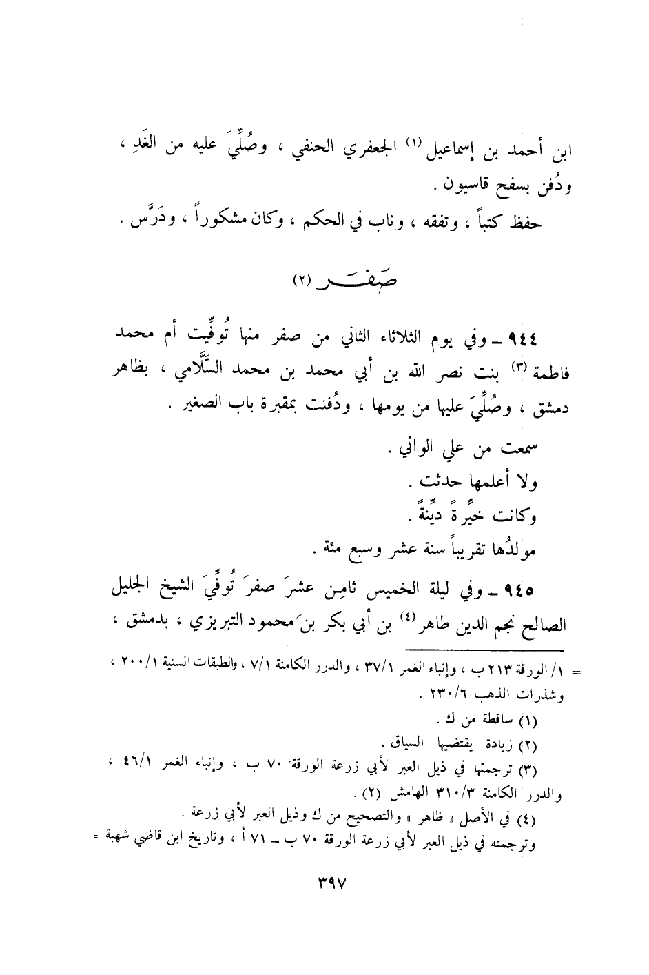 944 - وَفِي يَوْم الثُّلَاثَاء الثَّانِي من صفر مِنْهَا توفيت أم مُحَمَّد فَاطِمَة بنت نصر الله بن ابي مُحَمَّد بن مُحَمَّد السلَامِي بِظَاهِر دمشق وَصلي عَلَيْهَا من يَوْمهَا ودفنت بمقبرة بَاب الصَّغِير