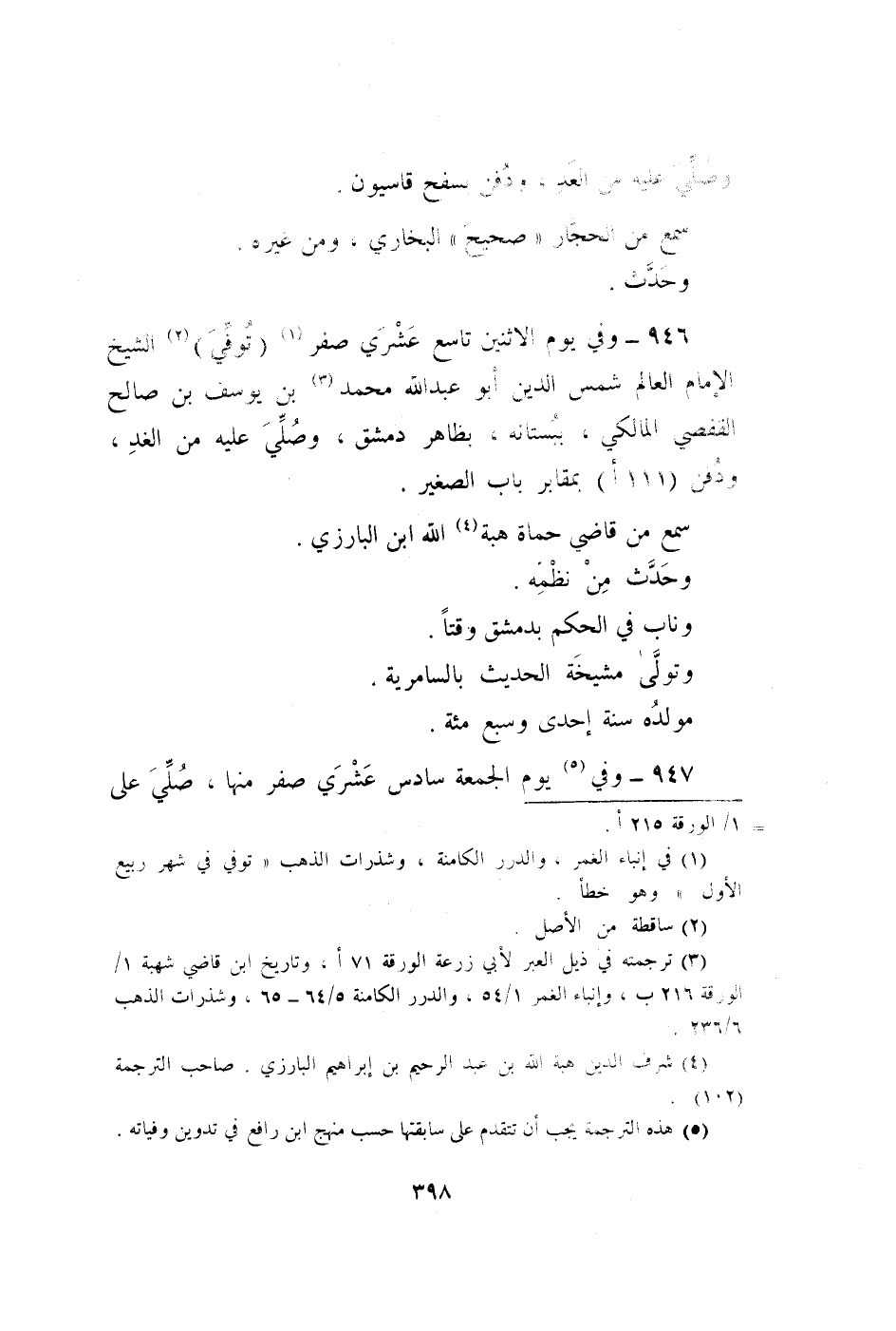 946 - وَفِي يَوْم الِاثْنَيْنِ تَاسِع عشري صفر توفّي الشَّيْخ الإِمَام الْعَالم شمس الدّين أَبُو عبد الله مُحَمَّد بن يُوسُف بن صَالح القفصي الْمَالِكِي ببستانه بِظَاهِر دمشق وَصلي عَلَيْهِ من الْغَد وَدفن (111 أ) بمقابر بَاب الصَّغِير