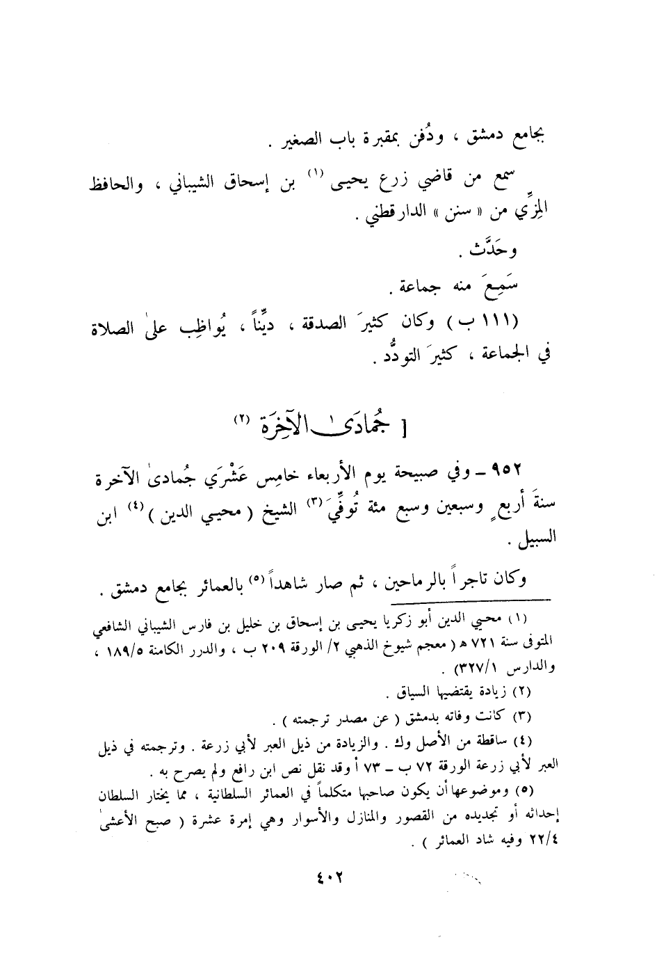 952 - وَفِي صَبِيحَة يَوْم الْأَرْبَعَاء خَامِس عشري جُمَادَى الْآخِرَة سنة ارْبَعْ وَسبعين وَسبع مئة توفّي الشَّيْخ محيي الدّين ابْن السَّبِيل