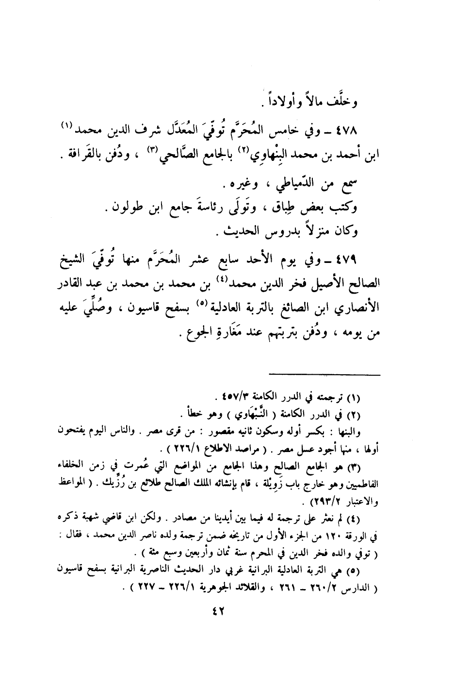 479 - وَفِي يَوْم الْأَحَد سَابِع عشر الْمحرم مِنْهَا توفّي الشَّيْخ الصَّالح الْأَصِيل فَخر الدّين مُحَمَّد بن مُحَمَّد بن مُحَمَّد بن عبد الْقَادِر الْأنْصَارِيّ ابْن الصَّائِغ بالتربة العادلية بسفح قاسيون وَصلي عَلَيْهِ من يَوْمه وَدفن بتربتهم عِنْد مغارة الْجُوع