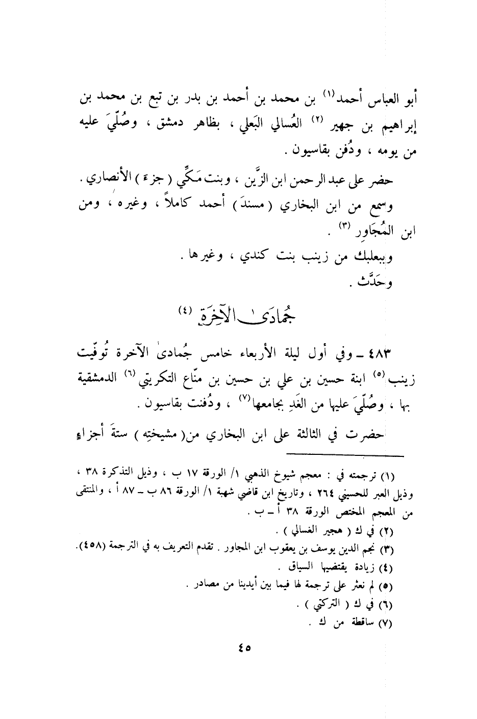 483 - وَفِي أول لَيْلَة الْأَرْبَعَاء خَامِس جُمَادَى الْآخِرَة توفيت زَيْنَب ابْنة حُسَيْن بن عَليّ بن حُسَيْن بن مناع التكريتي الدمشقية بهَا وَصلي عَلَيْهَا من الْغَد بجامعها ودفنت بقاسيون