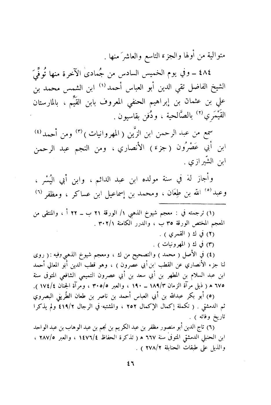 484 - وَفِي يَوْم الْخَمِيس السَّادِس من جُمَادَى الْآخِرَة مِنْهَا توفّي الشَّيْخ الْفَاضِل تَقِيّ الدّين أَبُو الْعَبَّاس أَحْمد ابْن الشَّمْس مُحَمَّد بن عَليّ بن عُثْمَان بن إِبْرَاهِيم الْحَنَفِيّ الْمَعْرُوف بِابْن الْقيم بالمارستان القيمري بالصالحية وَدفن بقاسيون