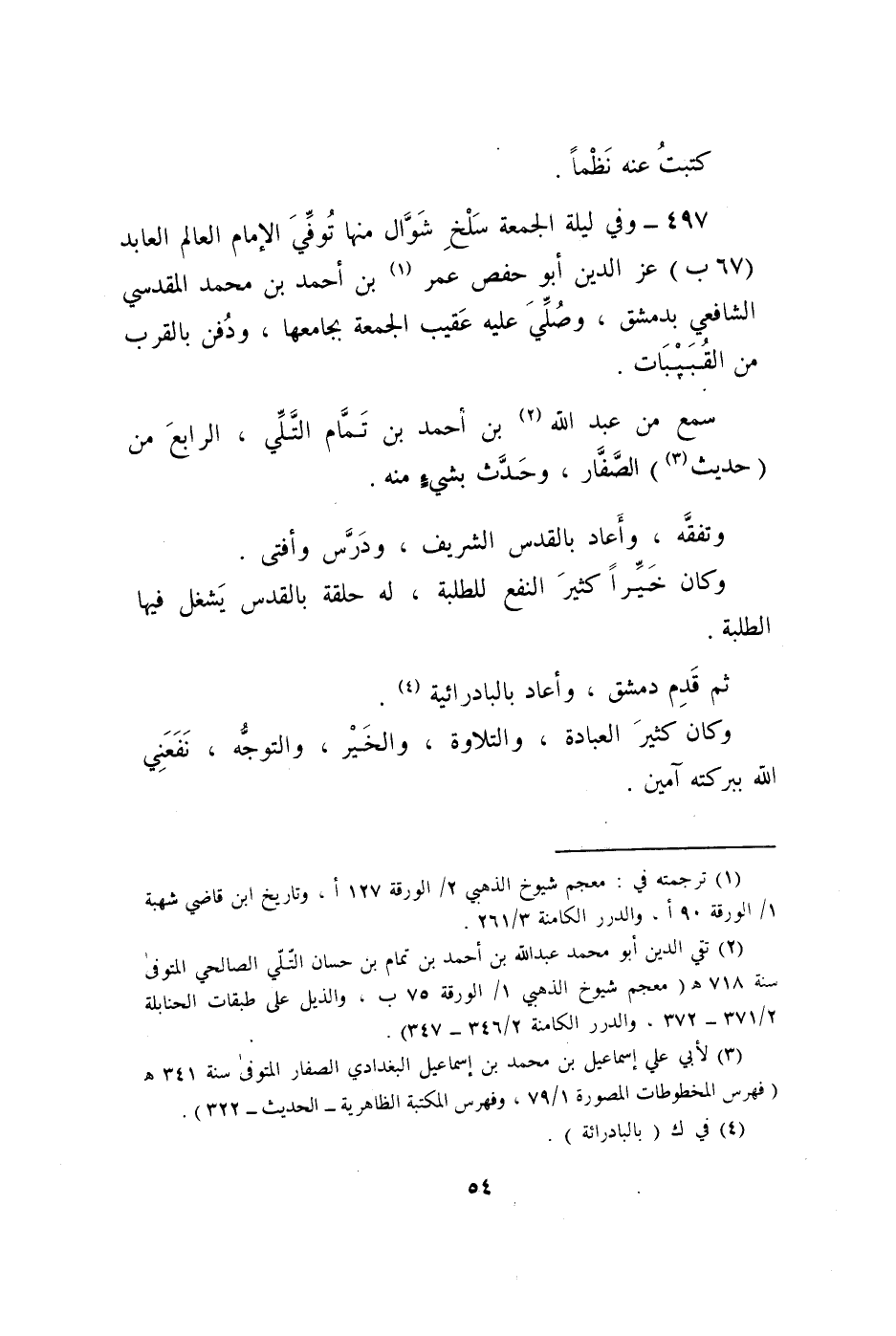 497 - وَفِي لَيْلَة الْجُمُعَة سلخ شَوَّال مِنْهَا توفّي الإِمَام الْعَالم العابد (67 ب) عز الدّين أَبُو حَفْص عمر بن أَحْمد بن مُحَمَّد الْمَقْدِسِي الشَّافِعِي بِدِمَشْق وَصلي عَلَيْهِ عقيب الْجُمُعَة بجامعها وَدفن بِالْقربِ من القبيبات