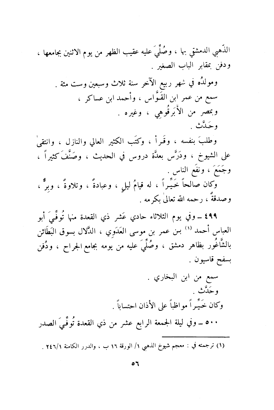499 - وَفِي يَوْم الثُّلَاثَاء حادي عشر ذِي الْقعدَة مِنْهَا توفّي أَبُو الْعَبَّاس أَحْمد بن عمر بن مُوسَى الْعَدوي الدَّلال بسوق البطائن بالشاغور بِظَاهِر دمشق وَصلي عَلَيْهِ من يَوْمه بِجَامِع الْجراح وَدفن بسفح قاسيون