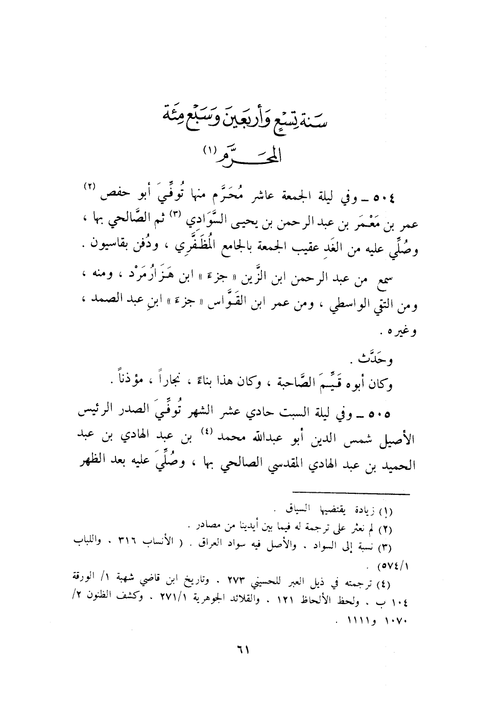 504 - وَفِي لَيْلَة الْجُمُعَة عَاشر محرم مِنْهَا توفّي أَبُو حَفْص عمر بن معمر بن عبد الرَّحْمَن بن يحيى السوادي ثمَّ الصَّالِحِي بهَا وَصلي عَلَيْهِ من الْغَد عقيب الْجُمُعَة بالجامع المظفري وَدفن بقاسيون