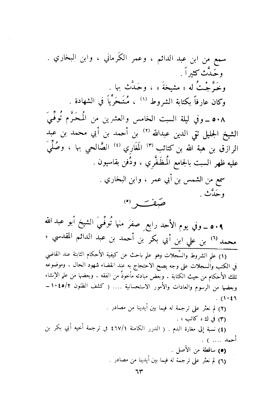 508 - وَفِي لَيْلَة السبت الْخَامِس وَالْعِشْرين من الْمحرم توفّي الشَّيْخ الْجَلِيل تَقِيّ الدّين عبد الله بن احْمَد بن ابي مُحَمَّد بن عبد الرَّزَّاق بن هبة الله بن كتائب المغاري الصَّالِحِي بهَا وَصلي عَلَيْهِ ظهر السبت بالجامع المظفري وَدفن بقاسيون
