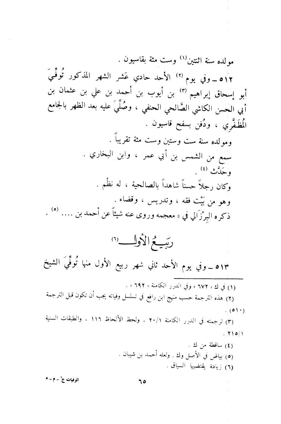 512 - وَفِي يَوْم الْأَحَد حادي عشر الشَّهْر الْمَذْكُور توفّي أَبُو إِسْحَاق إِبْرَاهِيم بن أَيُّوب بن أَحْمد بن عَليّ بن عُثْمَان بن أبي الْحسن الكاشي الصَّالِحِي الْحَنَفِيّ وَصلي عَلَيْهِ بعد الظّهْر بالجامع المظفري وَدفن بسفح قاسيون