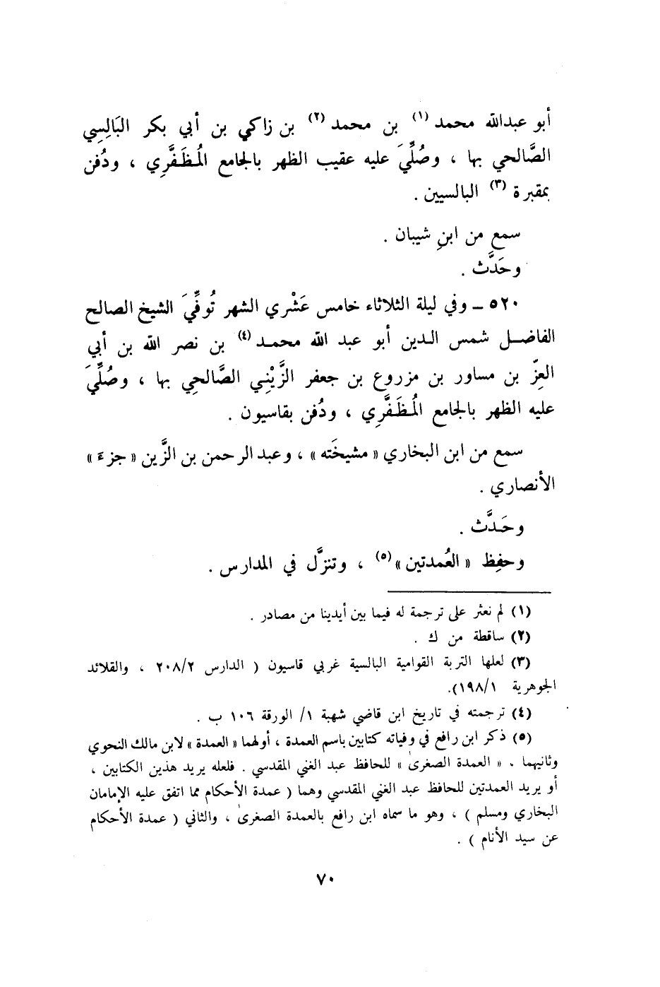 520 - وَفِي لَيْلَة الثُّلَاثَاء خَامِس عشري الشَّهْر توفّي الشَّيْخ الصَّالح الْفَاضِل شمس الدّين أَبُو عبد الله مُحَمَّد بن نصر الله بن أبي الْعِزّ بن مساور بن مزروع بن جَعْفَر الزيني الصَّالِحِي بهَا وَصلي عَلَيْهِ الظّهْر بالجامع المظفري وَدفن بقاسيون