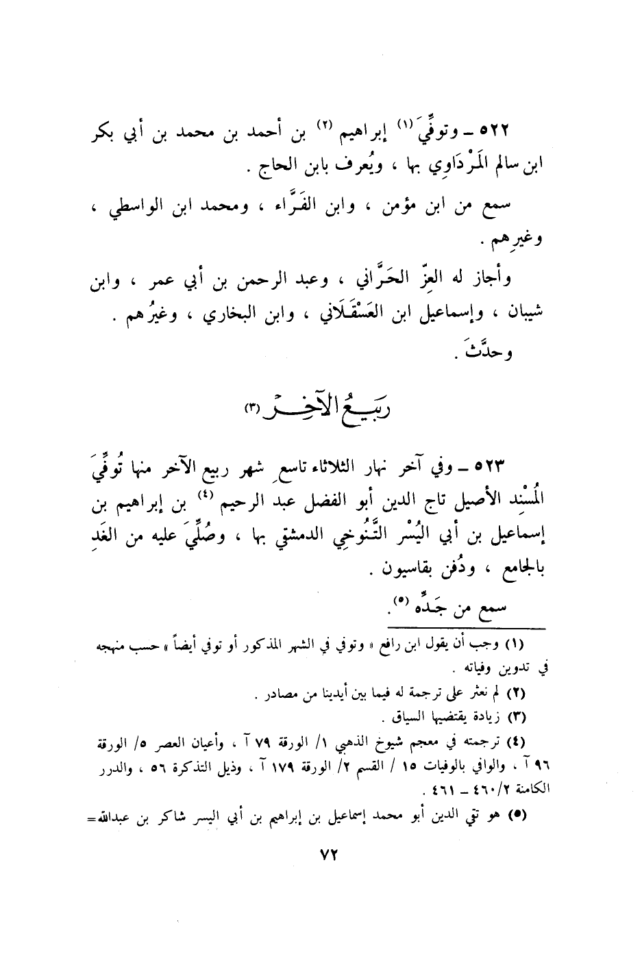 523 - وَفِي آخر نَهَار الثُّلَاثَاء تَاسِع شهر ربيع الآخر مِنْهَا توفّي الْمسند الْأَصِيل تَاج الدّين أَبُو الْفضل عبد الرَّحِيم بن إِبْرَاهِيم بن إِسْمَاعِيل بن أبي الْيُسْر التنوخي الدِّمَشْقِي بهَا وَصلي عَلَيْهِ من الْغَد بالجامع وَدفن بقاسيون