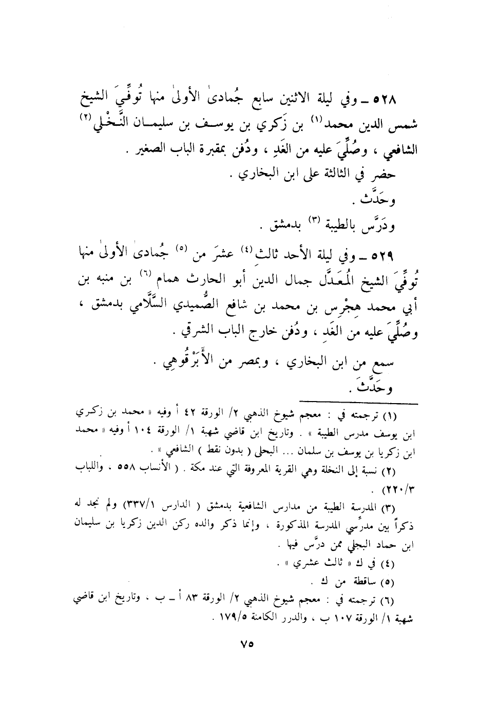 528 - وَفِي لَيْلَة الِاثْنَيْنِ سَابِع جُمَادَى الأولى مِنْهَا توفّي الشَّيْخ شمس الدّين مُحَمَّد بن زكري بن يُوسُف بن سُلَيْمَان النخلي الشَّافِعِي وَصلي عَلَيْهِ من الْغَد وَدفن بمقبرة الْبَاب الصَّغِير