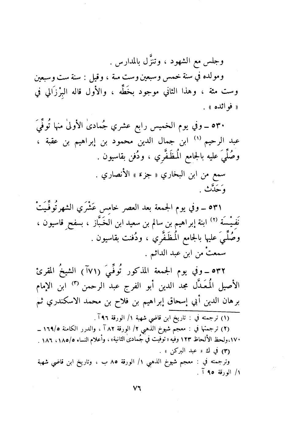 531 - وَفِي يَوْم الْجُمُعَة بعد الْعَصْر خَامِس عشري الشَّهْر توفيت نفيسة ابْنة إِبْرَاهِيم بن سَالم بن سعيد ابْن الخباز بسفح قاسيون وَصلي عَلَيْهَا بالجامع المظفري ودفنت بقاسيون