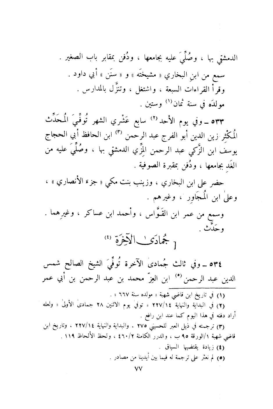 533 - وَفِي يَوْم الْأَحَد سَابِع عشري الشَّهْر توفّي الْمُحدث المكثر زين الدّين أَبُو الْفرج عبد الرَّحْمَن ابْن الْحَافِظ أبي الْحجَّاج يُوسُف ابْن الزكي عبد الرَّحْمَن الْمزي الدِّمَشْقِي بهَا وَصلي عَلَيْهِ من الْغَد بجامعها وَدفن بمقبرة الصُّوفِيَّة