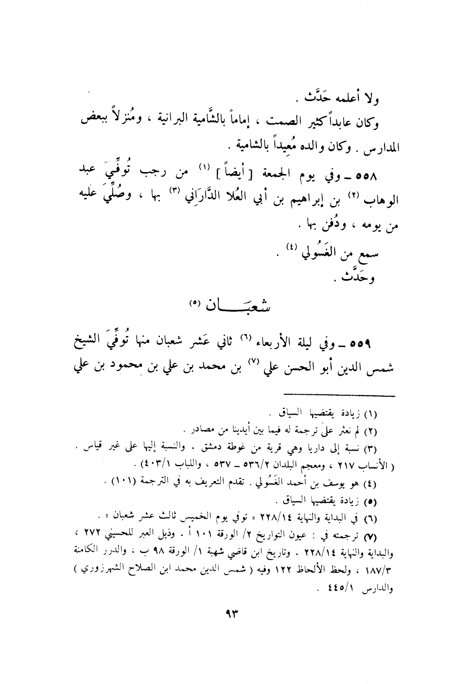 558 - وَفِي يَوْم الْجُمُعَة ايضا من رَجَب توفّي عبد الْوَهَّاب بن إِبْرَاهِيم بن أبي الْعلَا الدَّارَانِي بِهِ وَصلي عَلَيْهِ من يَوْمه وَدفن بهَا