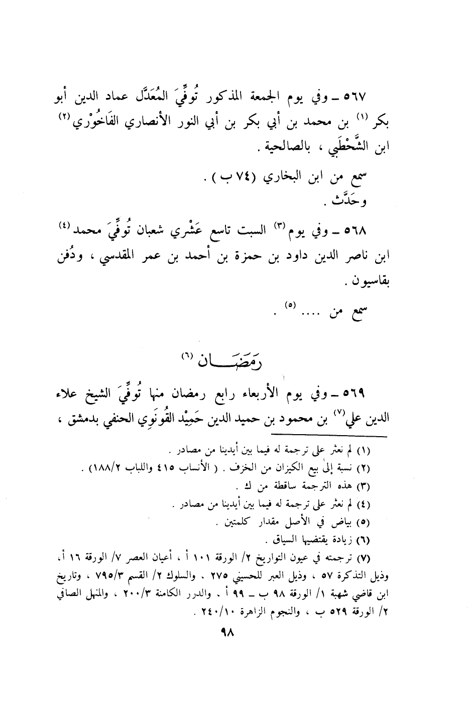 569 - وَفِي يَوْم الْأَرْبَعَاء رَابِع رَمَضَان مِنْهَا توفّي الشَّيْخ عَلَاء الدّين عَليّ بن مَحْمُود بن حميد الدّين الحميد القونوي الْحَنَفِيّ بِدِمَشْق