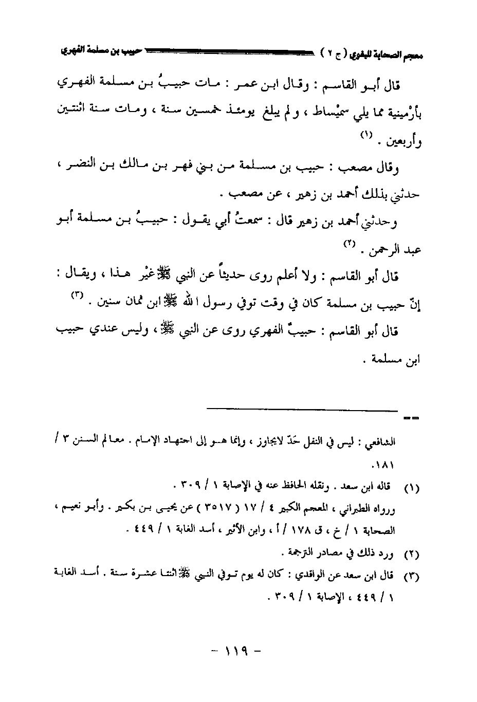 قال أبو القاسم: ولا أعلم روى حديثا عن النبي صلى الله عليه وسلم غير هذا ويقال: إن حبيب بن مسلمة كان في وقت توفي رسول الله صلى الله عليه وسلم ابن ثمان سنين.