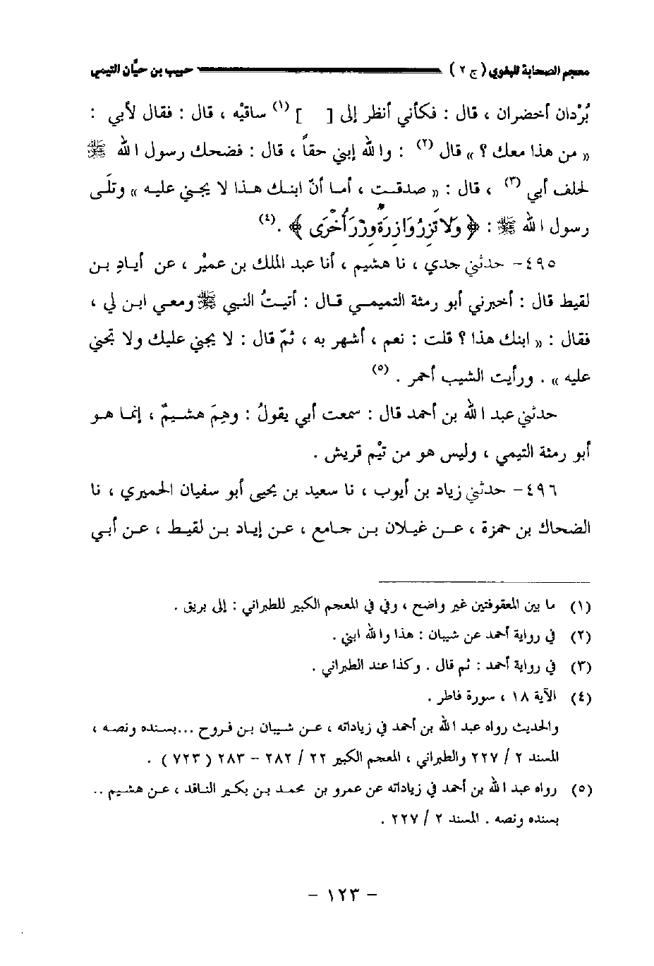 ٤٩٥ - حدثني جدي نا هشيم أنا عبد الملك بن عمير عن إياد بن لقيط قال: أخبرني أبو رمثة التميمي قال: أتيت النبي صلى الله عليه وسلم ومعي ابن لي فقال: " ابنك هذا؟ قلت: نعم أشهر به ثم قال: لا يجني عليك ولا تجني عليه ". ورأيت الشيب أحمر.