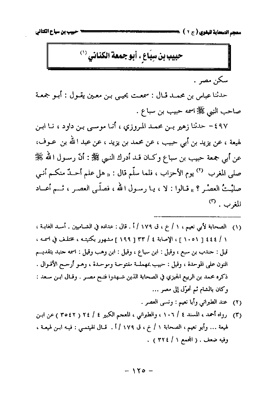 حدثنا عباس بن محمد قال: سمعت يحيى بن معين يقول: أبو جمعة صاحب النبي صلى الله عليه وسلم اسمه حبيب بن سباع.