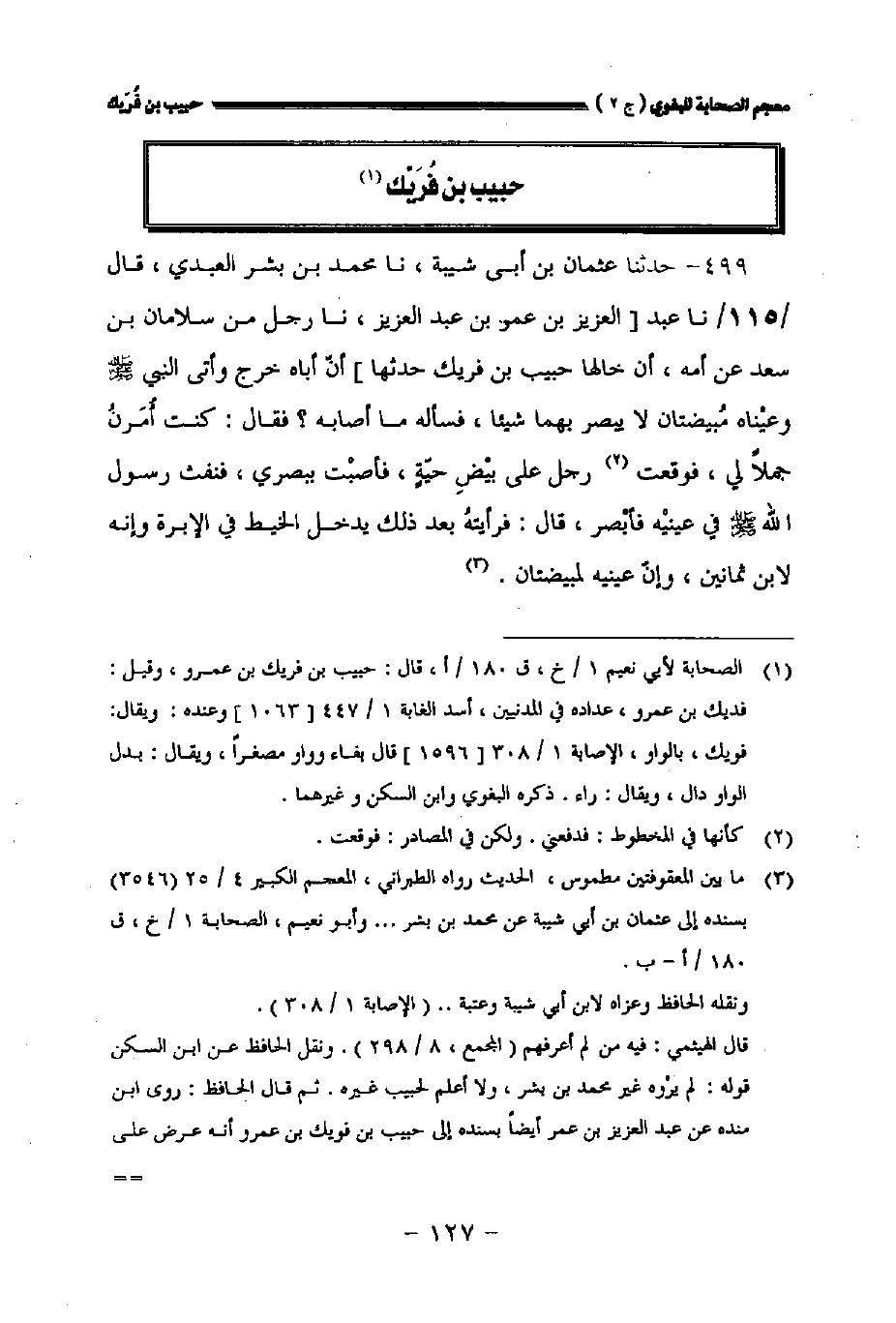 ٤٩٩ - حدثنا عثمان بن أبي شيبة نا محمد بن بشر العبدي قال نا // ١١٥ // عبد [العزيز بن عمر بن عبد العزيز نا رجل من سلامان بن سعد عن أمه أن خالها حبيب بن فريك حدثها] أن أباه خرج وأتى النبي صلى الله عليه وسلم وعيناه مبيضتان لا يبصر بهما شيئا فسأله ما أصابه؟ فقال: كنت أمرت جملا لي فوقعت رجل على بيض حية فأصبت ببصري فنفث رسول الله صلى الله عليه وسلم في عينيه فأبصر قال: فرأيته بعد ذلك يدخل الخيط في الإبرة وإنه لابن ثمانين وإن عينيه لمبيضتان.