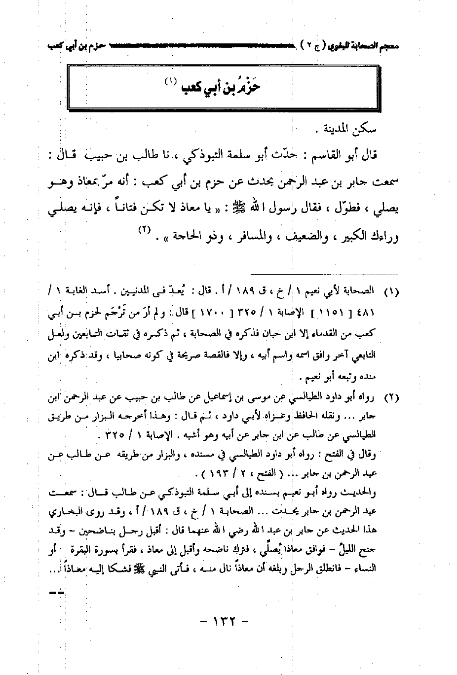 قال أبو القاسم: حدث أبو سلمة التبوذكي نا طالب بن حبيب قال: سمعت جابر بن عبد الرحمن يحدث عن حزم بن أبي كعب: أنه مر بمعاذ وهو يصلي فطول فقال رسول الله صلى الله عليه وسلم: " يامعاذ لا تكن فتانا فإنه يصلي وراءك الكبير والضعيف والمسافر وذو الحاجة.