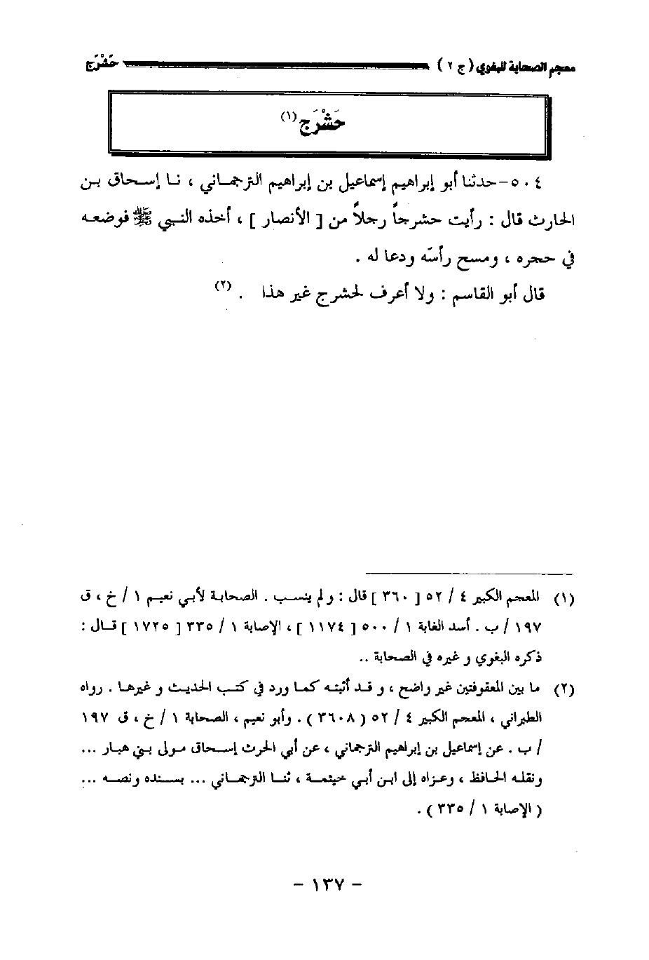 ٥٠٤ - حدثنا أبو إبراهيم إسماعيل بن إبراهيم الترجماني نا إسحاق بن الحارث قال: رأيت حشرجا من [الأنصار] أخذه النبي صلى الله عليه وسلم فوضعه في حجره ومسح رأسه ودعا له.